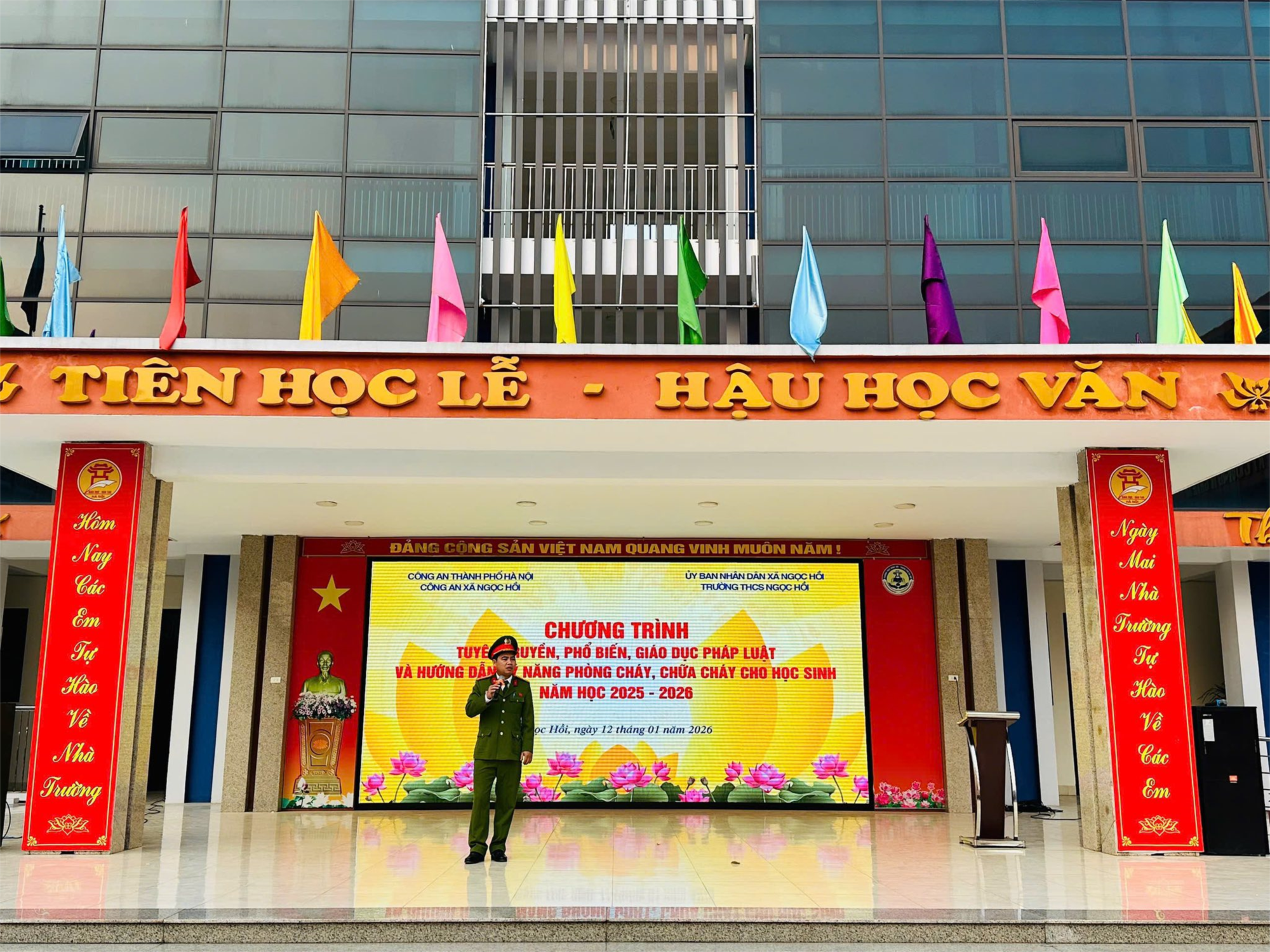 Sáng ngày 12/1/2026, Trường THCS Ngọc Hồi đã phối hợp với Công an xã Ngọc Hồi tổ chức chương trình tuyên truyền, phổ biến, giáo dục pháp luật và hướng dẫn kỹ năng phòng cháy, chữa cháy dành cho học sinh toàn trường. Đây là hoạt động thiết thực nhằm trang bị cho các em những kiến thức cơ bản về pháp luật, nâng cao ý thức chấp hành nội quy, quy định của nhà trường và pháp luật của Nhà nước.