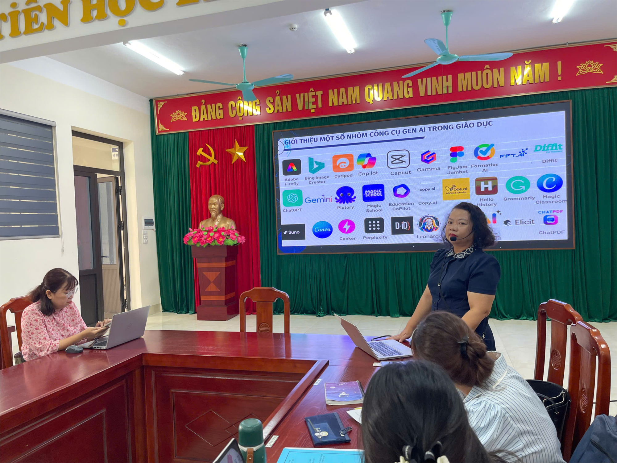 ✨ Buổi chuyên đề diễn ra sôi nổi, thiết thực với nhiều nội dung gần gũi, dễ áp dụng vào thực tế giảng dạy. Không chỉ giới thiệu tổng quan về trí tuệ nhân tạo và các mô hình ngôn ngữ lớn (LLM), cô giáo còn trực tiếp hướng dẫn giáo viên trải nghiệm các công cụ AI phổ biến như ChatGPT, Gemini, Copilot, Flow và Gamma.