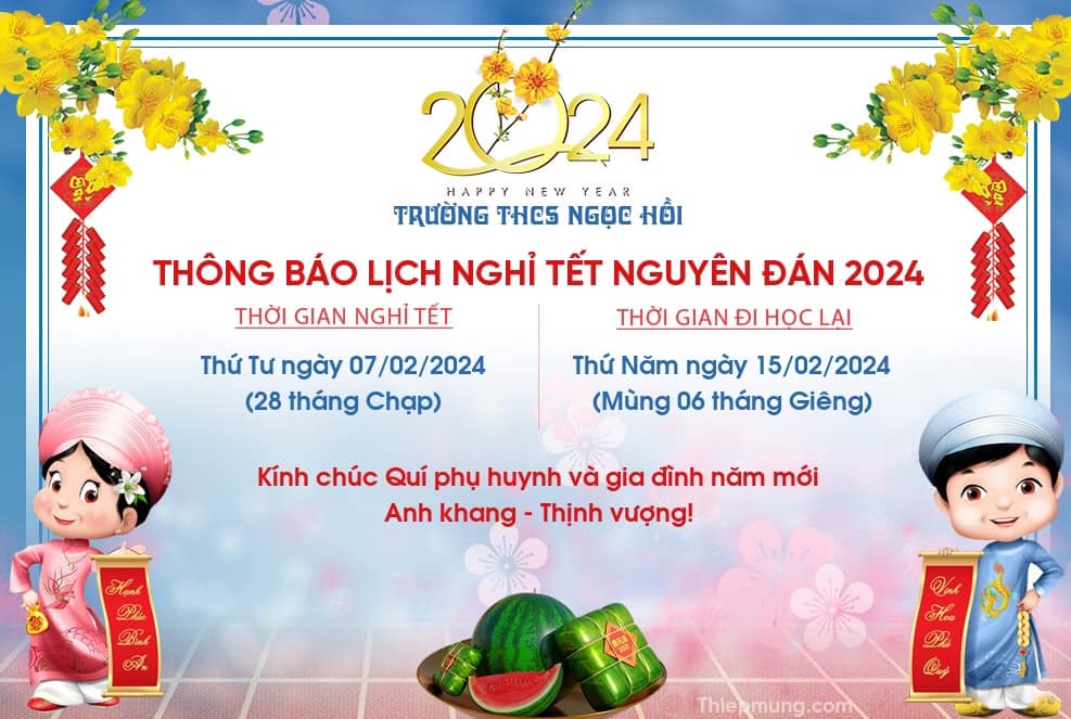 Trường THCS Ngọc Hồi thông báo lịch nghỉ Tết Nguyên đán 2024 bắt đầu từ ngày 7/2/2024 và đi học trở lại vào ngày 15/02/2024.